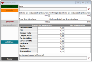 Após resolver todas as pendencias, o ADM mostrará uma tela de dados de turno mostrando toda movimentação, havendo a confirmação o turno será fechado.